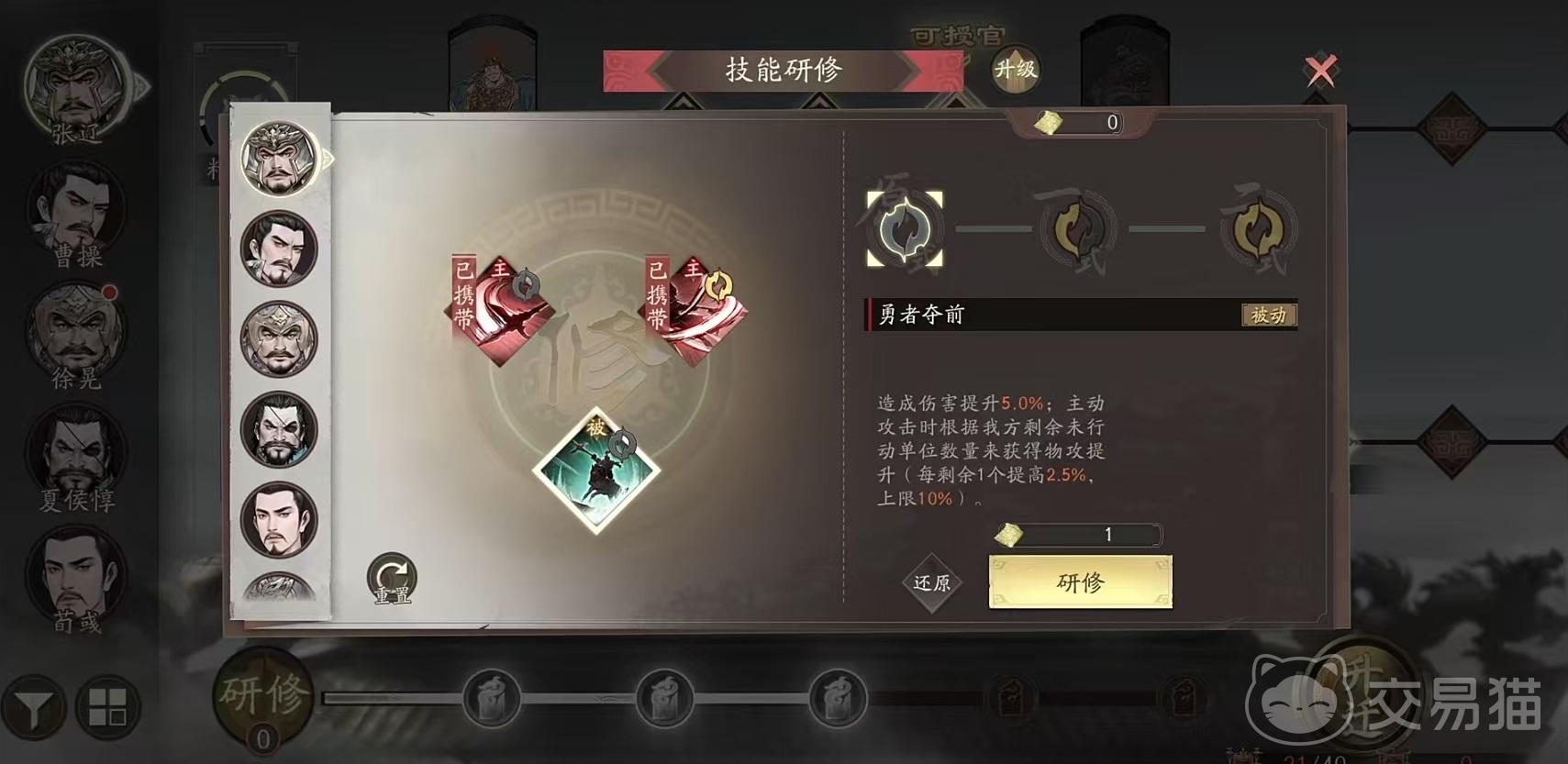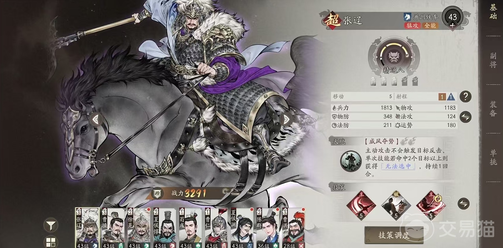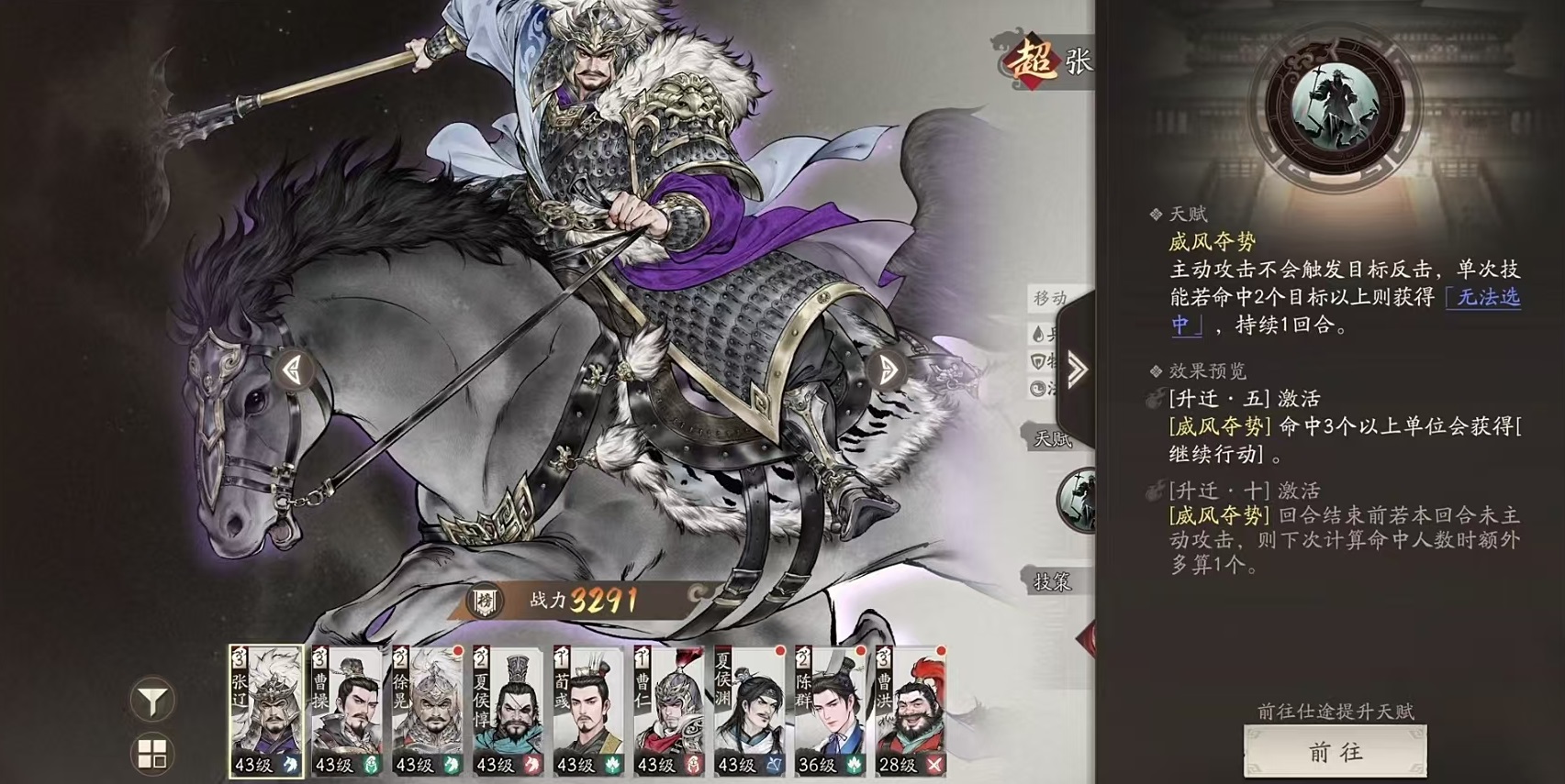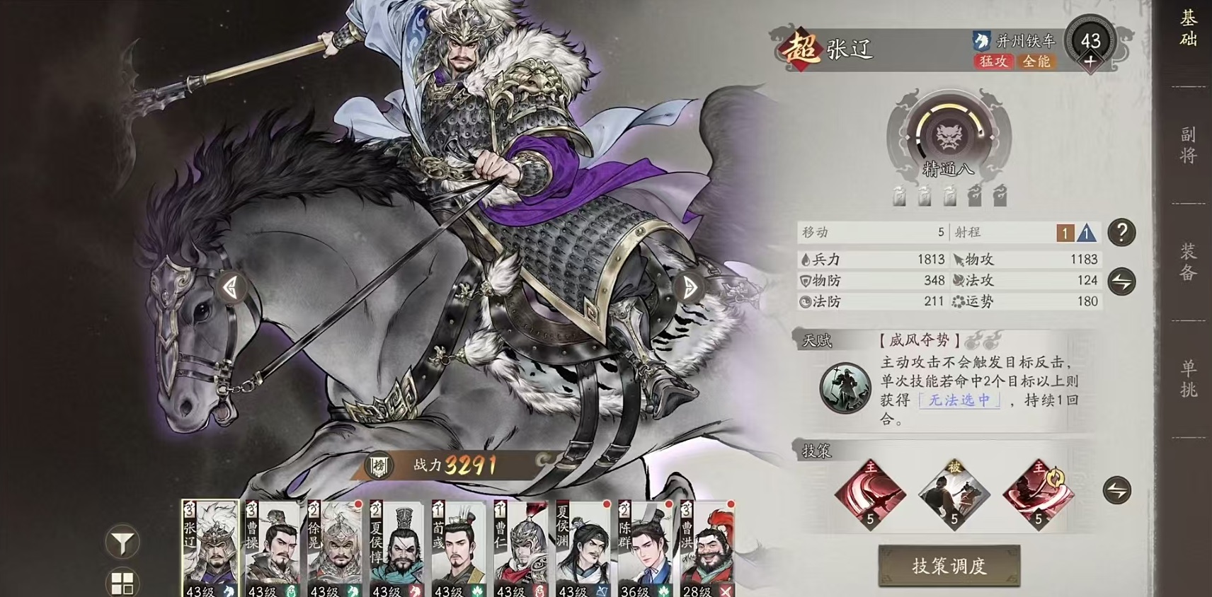 首先来看一下张辽的天赋威风夺势,他的主动攻击不会触发目标反击,单次技能如果命中两个目标以上,则获得无法选中状态,该状态持续一回合。通过提升效果,该天赋还会增加命中三个以上单位获得继续行动加成,回合结束前,若本回合未主动攻击,下次计算命中人数时额外加1。这个天赋就使得张辽在战斗中可以放心输出,不会受到对方的反击,这样在战斗中就能少受很多伤害,所以张辽不仅输出强,站场能力也很出色。