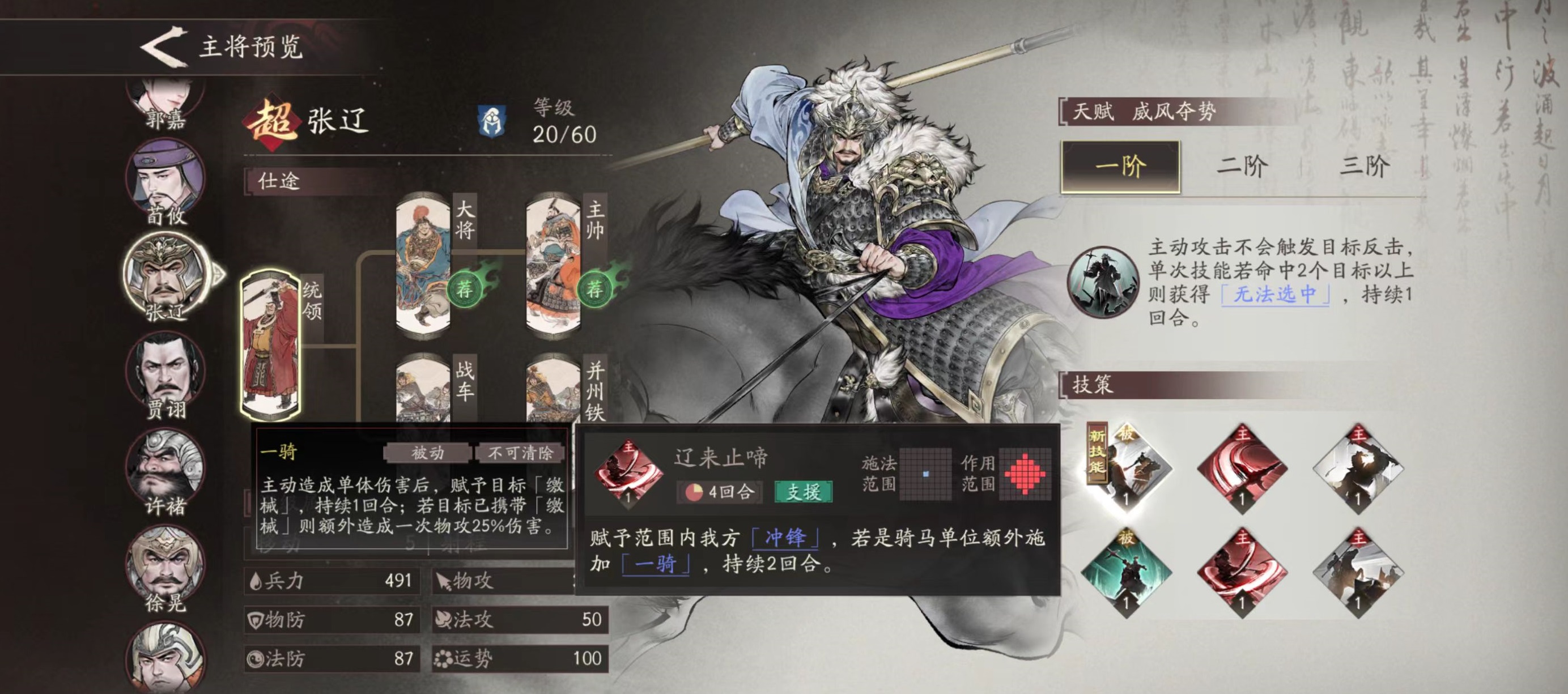 张辽在游戏中拥有非常高的泛用性,首先自身是属于骑兵机动性非常强,很适合开荒选择,在自身天赋的影响下,可避免对方反击,这样在很多战斗中都有优势。即使在零命的情况下,依然有着非常强力的效果,在主动攻击敌方时,使用的技能直接伤害一条直线上的敌人,如果命中两个或以上的目标,自身会处于无法选中状态。对方无法锁定,当然会受到更少的伤害,很适合单人突袭。张辽转职之后还能获得提升范围友军增益的技能。