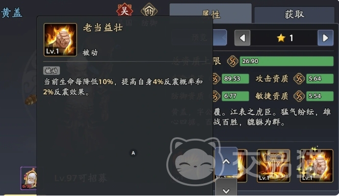 黄盖的被动技能聚元为力,能够提升黄盖20%+6的生命上限,当黄盖被控制时,还能够额外提升4.5%的伤害减免,这一效果确保了黄盖在面对冰冻、沉默等控制技能时,依然能够承受住敌人的攻击,避免援护链中断,被动技能老当益壮可以说是他残血反震流的核心,根据这一技能的效果,黄盖的血量每降10%,反震概率就会增加4%、反震效果增加2%,最高降血70%时,反震概率+28%、效果+14%。