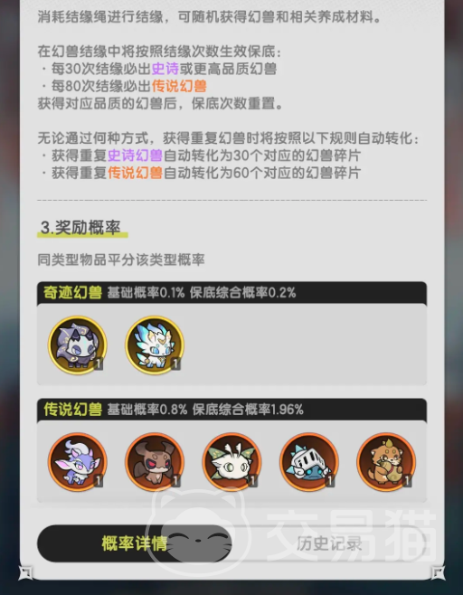 所以大家想要100%抽到的话就要依靠保底机制,一旦触发保底机制的话,那么抽到的概率就会上升为0.2%。然后每次保底都需要至少八十抽,所以大家想要获取该幻兽的话,只能靠运气了。毕竟靠氪金的话,那至少要抽个几百抽,才可以保证自己大概率获取。