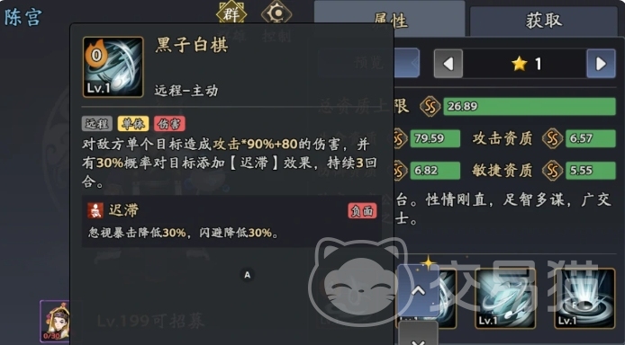 而被动技是可以把迟滞的效果转为冰冻,就是后面受击就会解除,同时还会承受200%的伤害,另一个被动则是在陈宫死亡时有46%概率重生,并且回复14%生命并立即释放大招,主动技黑子白棋,能对单体造成90%攻击+80伤害,有30%概率挂迟滞,这个技能主要定位为单点补控技能,在战斗中应优先对敌方主C释放,在加点优先级方面,应按照太极无双→背却苍天→落子无悔→黑子白棋的顺序进行。