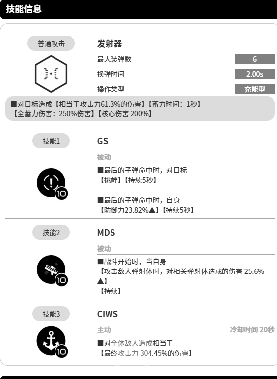 与此同时她自身的防御力会得到提升,幅度高达10.42%,同样持续5秒,在战斗场景中,挑衅技能所产生的效果是可以有效吸引敌人的火力,为身后的输出手队友们营造出一个相对安全且稳定的输出环境的,技能2同样是被动技能,安克在攻击敌人发射体时,会有加成,她对相关发射体所造成的伤害将会提升11.2%,而爆裂技能则是主动技能,它拥有20s的冷却时间。