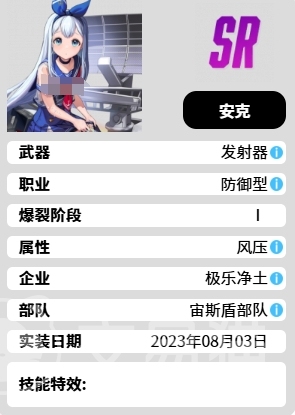 安克隶属于极乐净土麾下的宙斯盾部队,她总是以一身清新可爱的水手服打扮示人,就算是处于没有被培养的时期,也就是一阶段的时候她的能力在战斗中也是有着独特的表现,职业定位明确地指向了防御型,而她所擅长使用的武器则是那充满科技感的发射器,她的普通攻击方式是通过发射器来实现的,这种攻击模式属于充能型操作,也是很多防御角色都会用到的效果。