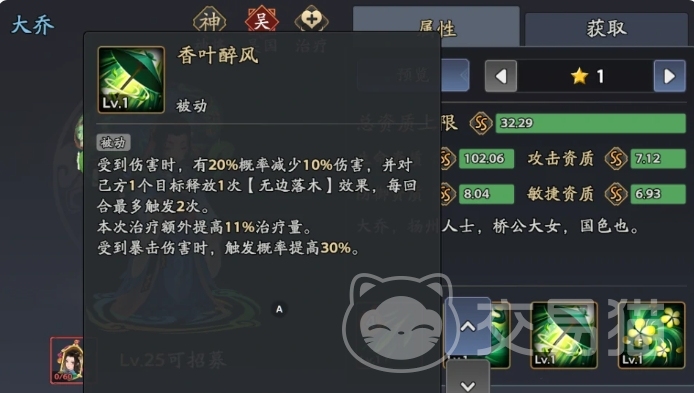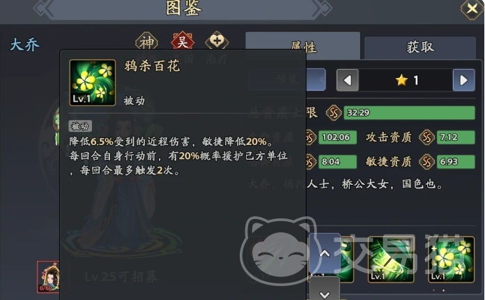 大乔的被动鸦杀百花同样有着独特的效果,它能够降低6.5%近程伤害,而且每回合行动前20%概率援护队友,这一援护机制可以让大乔在关键时刻挺身而出,为队友抵挡普攻或者单体技能的攻击,不过需要注意的是,该技能会降低20%敏捷,这就要求在使用大乔的过程中,要合理地考虑速度属性的弥补问题,从定位来看鸦杀百花属于前排承伤辅助技,虽然有着牺牲敏捷的不足,但其援护功能在团队战斗中还是有用的。