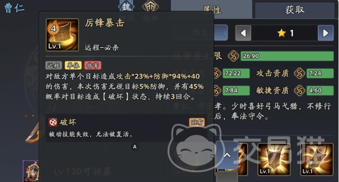 在灼烧爆发层面,诸葛亮在回合结束之际,能够触发灼烧伤害,祝融夫人凭借群体攻击技能,迅速将灼烧效果扩散至更多敌人身上,而周瑜则凭借自身技能,进一步提升灼烧收益,除了阵营之外,大家深入探究曹仁的技能机制,就会发现他的大招厉锋暴击,能够对单体造成攻击 23%+防御 94%+40的伤害,并且无视目标 5%防御,同时还有45%概率挂上破坏效果,禁止目标复活。