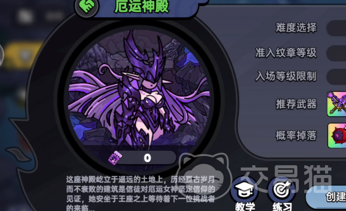 厄运神殿是游戏里的一个副本,玩家需要和其他的成员联合起来,共同挑战厄运女神这个boss,每次对战支持1~4名成员组成队伍,并且即使挑战失败,死亡之后也不会掉落任何的装备,感兴趣的玩家都可以来游戏里尝试对战,想要和鳄鱼女神对战,首先需要去了解这个boss的特性,首先这个boss拥有50万的血量,相对来说是血量比较厚的一个角色,其实角色还有1000的攻击力,每次攻击的时候还会附带烧伤效果,并且免疫物理攻击。