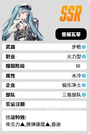 普丽瓦蒂的主动效果可以带来90%左右的伤害,然后让敌人陷入昏迷状态,持续3秒,这一技能在团战中的作用很大,它不仅能够对敌方全体造成大面积的伤害,削弱敌人的整体战斗力,还能通过昏迷效果打乱敌人的战斗节奏,而在配队方面,普丽瓦蒂的技能特点也提供了丰富的策略选择,由于她技能1加成攻击、换弹速度,并对最大装弹数有50.66%的Debuff,且等级增加只加攻击和换弹速度,不再增加该Debuff,所以在配队时需要充分考虑这一特性。