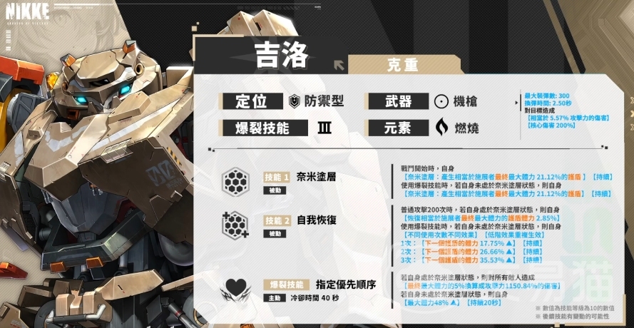 吉洛在妮姬群体中由于自身性能在某些方面并不十分出色,她曾多次更换所属阵营,作为一名防御型角色,吉洛在战斗中展现出了独特的战斗风格和强大的防御能力,她手中那挺威力不凡的机枪隐遁者还是很显眼的,这把机枪具备燃烧属性,拥有高达300发的装弹量,换弹时间仅需2.5秒,而吉洛真正的战斗特色,还要数她与T.A.L.O.S.装甲的协同作战能力,她的技能机制巧妙地围绕着护盾这一关键元素构建而成,形成了一套独特而又高效的战斗体系。