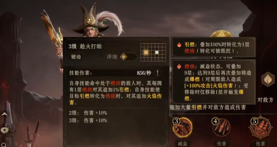 在当前版本中,燃烧队的核心是角色“渎职者”。他的三技能“燃尽一切”构成了整个队伍输出机制的核心:该技能对所有敌人造成火焰伤害,并附带50%的引燃效果。更关键的是,它能够立刻引爆敌人身上已有的燃烧状态,消耗其中一半层数,转化为额外伤害,极大提升了爆发能力。