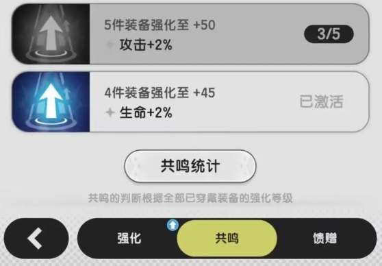 随着游戏的推进,会开放强化装备的功能,这里有一个非常关键的点需要大家特别注意,那就是一定要对装备进行平均升级,因为游戏中的装备强化存在着共鸣效果,具体来说就是当达到4件装备5级、4件装备35级以及4件装备40级、4件装备45级等这些等级条件时,就会触发共鸣效果。