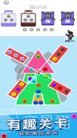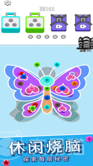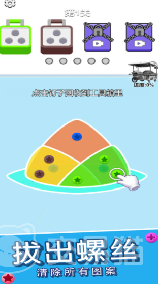 里面总共有50多个关卡,每一个关卡中呈现的图案都不一样,一般都会设定1~2个空位,需要借助这些空位移动螺丝钉,保证图案顺利拆除,这些螺丝钉都是彩色的,拆除下来之后玩家还可以进行分类整理。把颜色相同的螺丝钉收纳到一起,很多关卡看似简单,但其实都有一定的难度,可以通过不断尝试,找出最佳的解决方案,顺利通关。