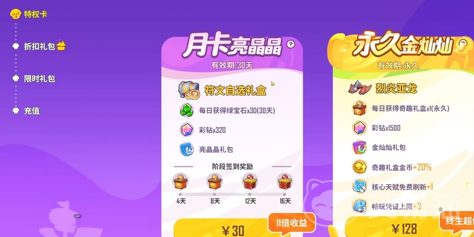 游戏中的月卡分为两种,一种是价值30元的月卡,有效期30天,在月卡期间每日登陆能获得绿宝石、彩钻、亮晶晶礼包还有阶段性的签到奖励,其中最有价值的还是符文礼包;另外一种是价值128的永久会员卡,能在登陆后获得奇趣礼盒、彩钻、金灿灿礼包、奇趣礼包、核心天赋免费刷新等,最为关键是还能获得稀有的“烈炎亚龙”宠物。在是否要购买月卡上,玩家们谨慎选择,合理消费。