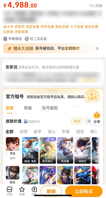 第三,买号赠送永久包赔,实现售后无忧。平台许多成品号支持这一保障,规避买家帐号被找回、封禁、被毁、角色丢失等风险。买家帐号被删除,通过图片等凭证,向交易猫客服索赔。