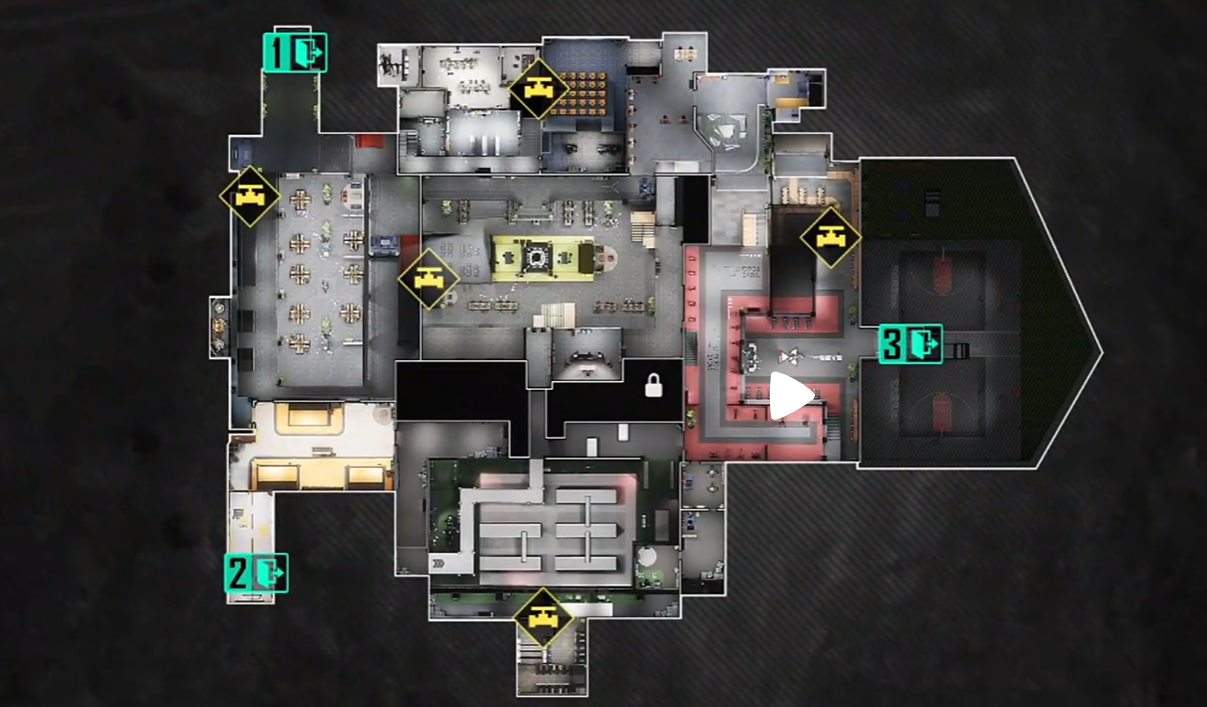 这是一张全新的室内地图,地图的大小与巴夫工厂差不多,没有游荡者分布其中,是一张纯PVP地图。萤火工作室的主要区域分为入口大厅,办公区,会议区,战术区,以及健身餐饮区,撤离点位分别位于下图的这三个区域。