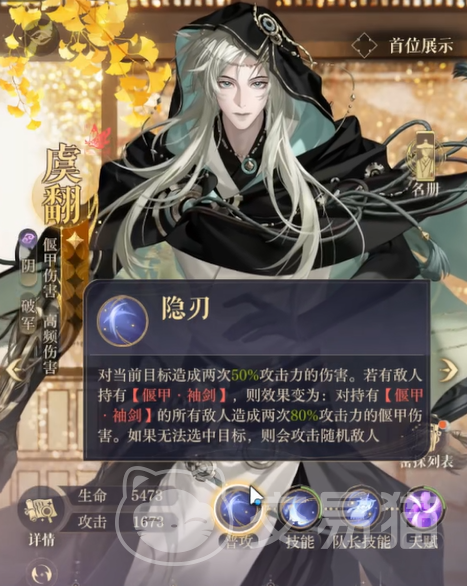 首先来看虞翻的普攻技能“隐刃”。这一技能能够对目标造成两次伤害,并且在敌人身上持有“偃甲·袖剑”效果时,普攻会转化为对所有持有该效果的敌人进行两次偃甲伤害。这意味着,虞翻的普攻不仅具备高频率的伤害输出,还能够通过敌人身上的特殊效果,扩大伤害范围。此外,如果敌人处于无法选中状态,虞翻会随机选择目标进行攻击,这也为他的普攻增添了一定的随机性和灵活性。