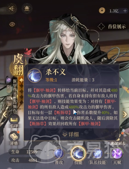 虞翻的核心技能是“杀不义”,该技能可以将“偃甲·袖剑”效果转移到攻击目标身上,并对目标造成偃甲伤害。如果敌人已经持有该效果,虞翻的技能会扩展为对所有持有“偃甲·袖剑”效果的敌人造成伤害。此外,如果敌人身上有“断肠草”效果,技能的伤害会进一步提升。通过这一技能,虞翻不仅能够对敌人进行高效的控制,还能够通过消耗敌人身上的“断肠草”效果,增加自己的输出能力。