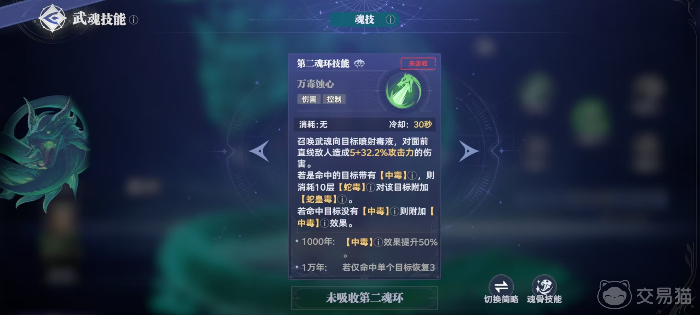 在最为关键的奥义技能方面,碧磷蛇皇的技能效果是直接释放剧毒领域,这个领域持续10秒钟,通过消耗蛇毒来对范围敌人造成高额伤害。魂技的效果是召唤武魂向目标喷射毒液,对面前的直线敌人造成伤害,如果命中的目标带有中毒,则将消耗10层蛇毒,对目标附加蛇皇毒。没有中毒的目标会受到中毒效果。结合这些技能效果,大家不难看出,碧磷蛇皇在输出方面并没有太高的爆发,它就是依赖自身的各个技能机制来实现中毒叠加。同时还具有一定的控制效果,但控制也并不属于硬控。
