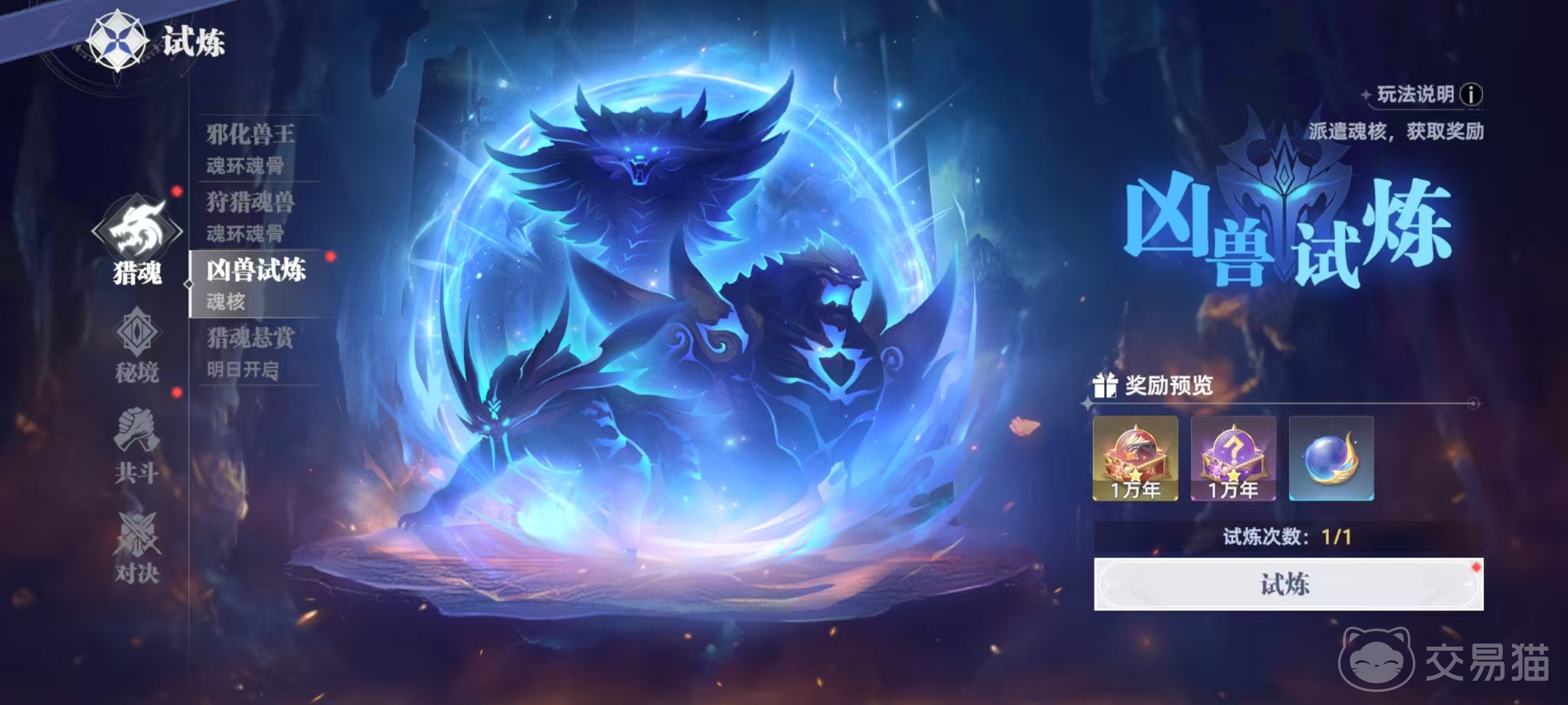 凶兽试炼一定要记得选择试炼武魂,然后获取魂核奖励,试炼需要派出4个武魂。今天已经完成试炼的武魂,无法再次进行试炼。奖励由奖励等级决定,一共有9档,选择的试炼武魂品质星级越高,试炼等级也就越高,这也是每天不可错过的一项。