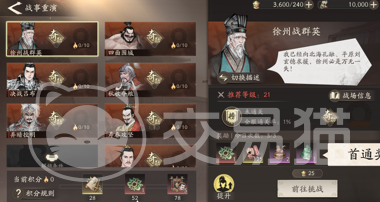 大家需要按顺序去挑战,也就是说需要从徐州战群英开始打,在打的时候可以在界面看到这一关的通关要求和难点所在,大家需要了解这些然后去做针对性的布局,从而进行完美通关,完美通关需要拿到10分。