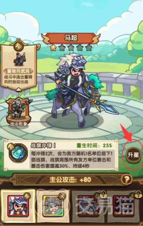 马超是重骑兵武将,他的天赋是每冲锋两次,就会为我方随机两个队友插下一面战旗,在战旗周围的所有队友暴击和暴击伤害都会提升50%,持续4秒钟的时间,在实战中不仅能输出,还能提升队友们的技能效果。