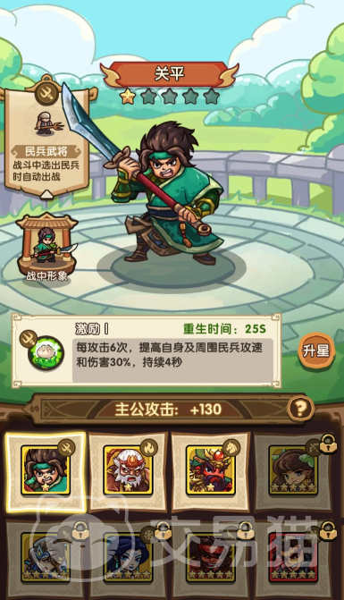 关平只要升到10级就会解锁民兵自动跟随出战的能力,他的天赋是每攻击6次,就会在接下来的4秒内,提高自身和其周围民兵的攻速和伤害,要知道民兵可是前期主要战力兵种,所以该武将可以说是前期关卡必备。