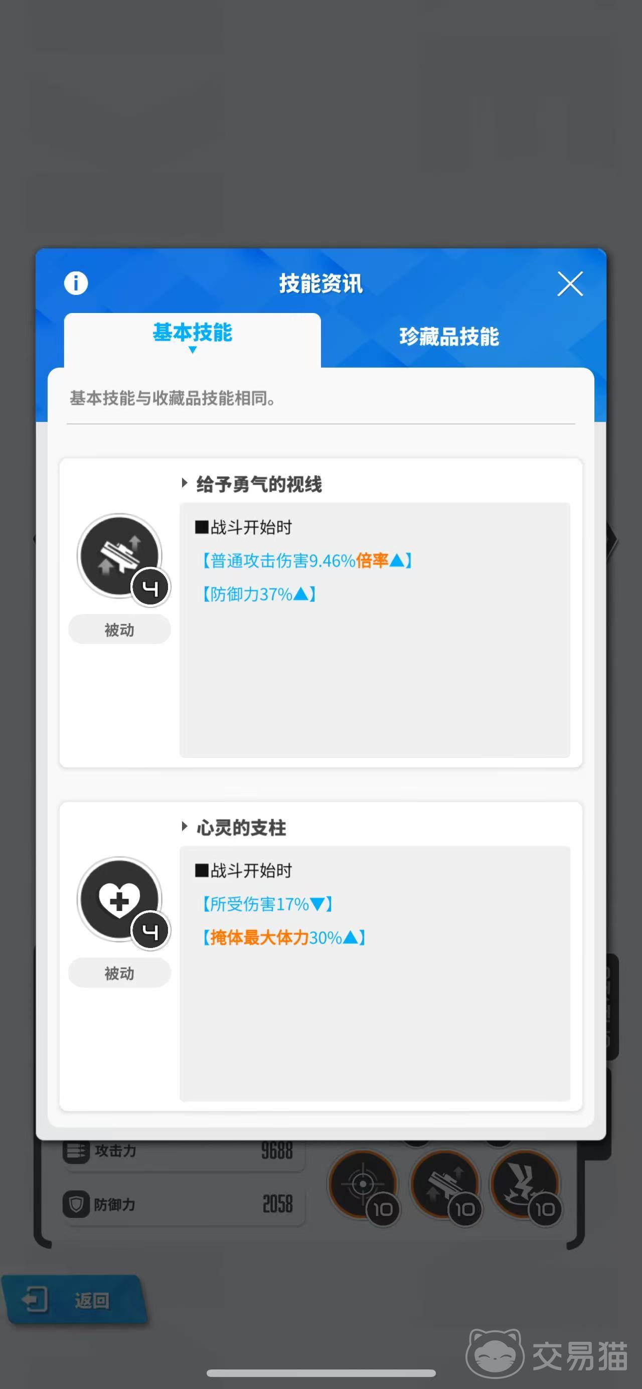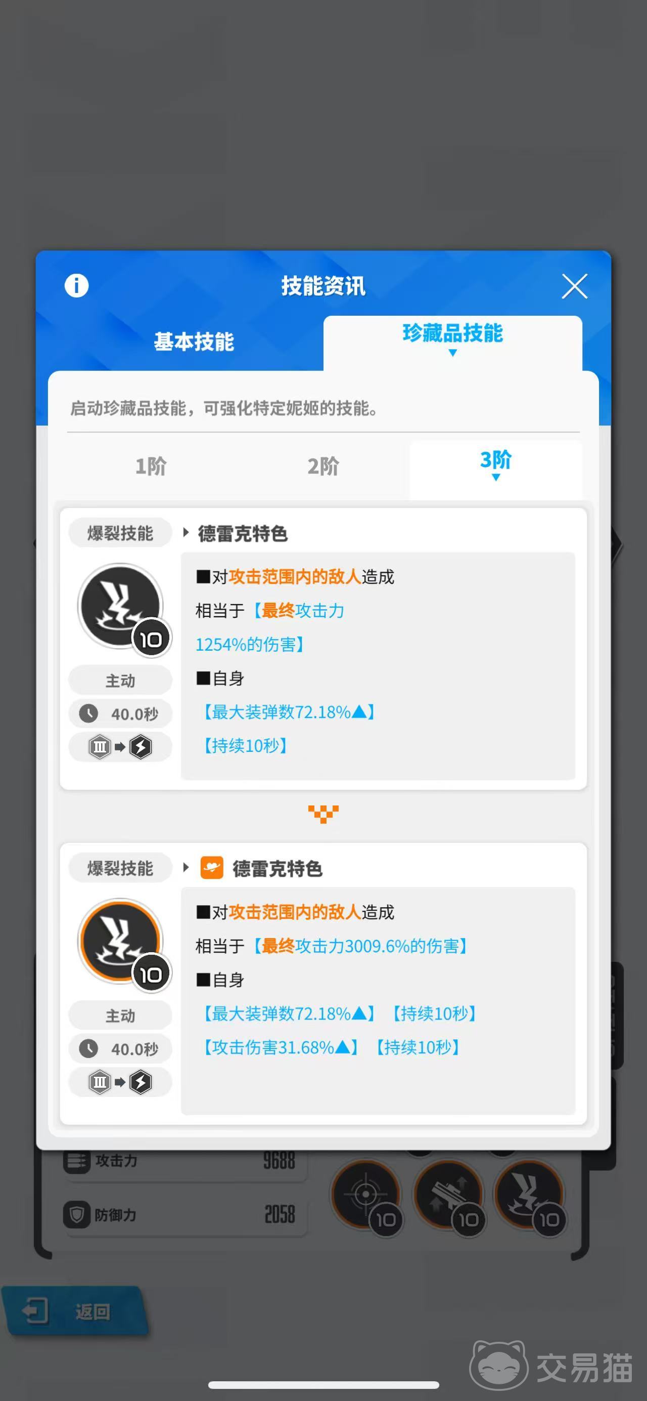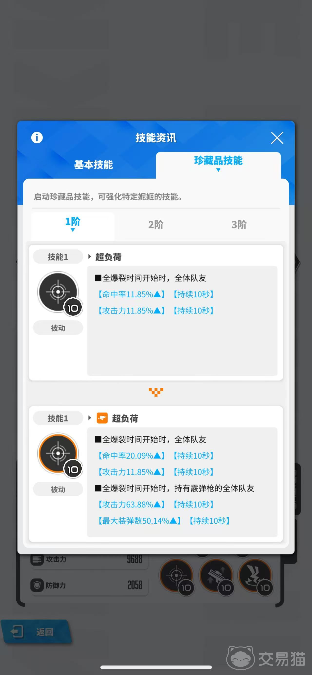 然后再来看一下珍藏品技能,其中就分为一阶二阶三阶。一阶段时,当全爆裂的时间开始后,就可以增加全体队友的命中率以及攻击力。如果拥有散弹枪的话,那攻击力以及装弹都会提升。