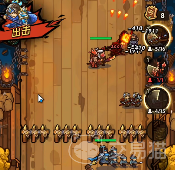 首先一开始玩家们的战斗力尽量在400以上才行。我们所需要带的兵种有两个,第一个是火法,因为本关前面的的小兵基本上都是弱火的。使用火法并且活用它的技能的话那么对付普通敌人将会很轻松。