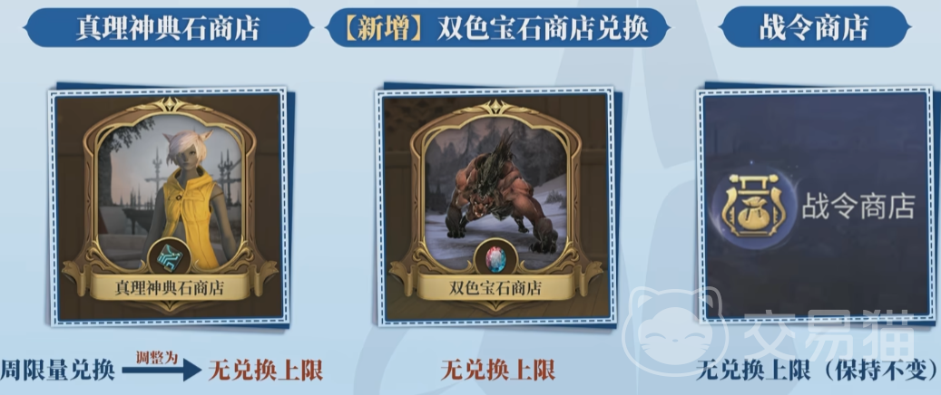 然后就是大家比较关注的手游商业化改动内容,这里结合此前策划的直播内容来帮大家总结一下。首先是“禁忌魔晶石”的兑换限制以及获取途径做了调整,从之前的战令商店兑换、真理神典商店每周3个,调整为了真理神殿商店无上限。新增双色宝石兑换,也是无上限的。