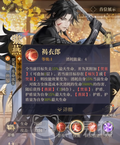 整体来看,张燕不仅是外表帅气的“颜值担当”,更是一名非常强力的火系密探。凭借其出色的技能设计,能够在战斗中担任核心输出角色,尤其是他强大的增伤与多次行动能力,能够帮助队伍迅速建立优势。如果你是火系密探的爱好者,张燕无疑是一个值得期待的强力角色,不仅能在输出上带来巨大的冲击力,还能通过天赋和大招提供团队的生存保障。