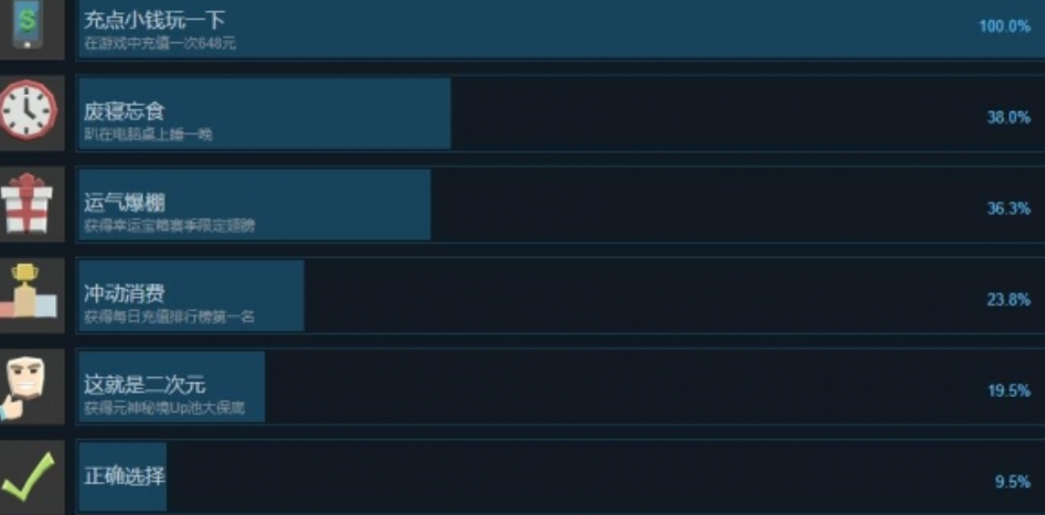 说到成就玩家如果在游戏中充值648元,就会获得充点小钱玩一下的成就。有些玩家会选择趴在电脑桌上直接睡了一晚,这个就被称之为废寝忘食。当然玩家如果获得幸运宝箱赛季限定的翅膀的话,此时代表玩家运气爆棚。如果玩家每天都选择充值,并且在充值排行榜上排第一的话就会获得冲动消费的成就。另外在幸运宝箱上面10连抽直接抽出了两个传说级别的物品,这时候玩家就被称之为欧皇。