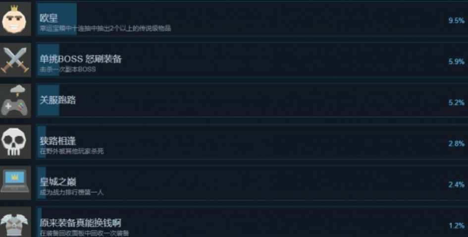 在体验游戏的时候,如果玩家狂刷装备,击杀一次副本boss,这时候就会获得单挑boss的成就,要是在野外直接被其它的玩家杀死,玩家就获得了狭路相逢的成就。