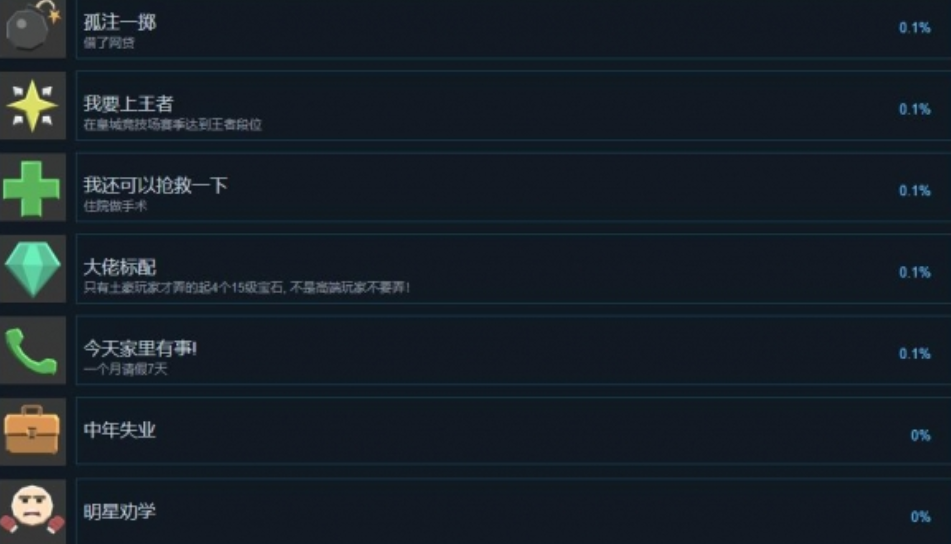 其实在游戏中涉及到的成就还有很多,比如玩家直接借了网贷就被称之为孤注一掷,或者在皇城竞技场当中得到了王者的段位,那么就被称之为我要上王者,另外玩家一个月请了7天假,代表家里面有事。