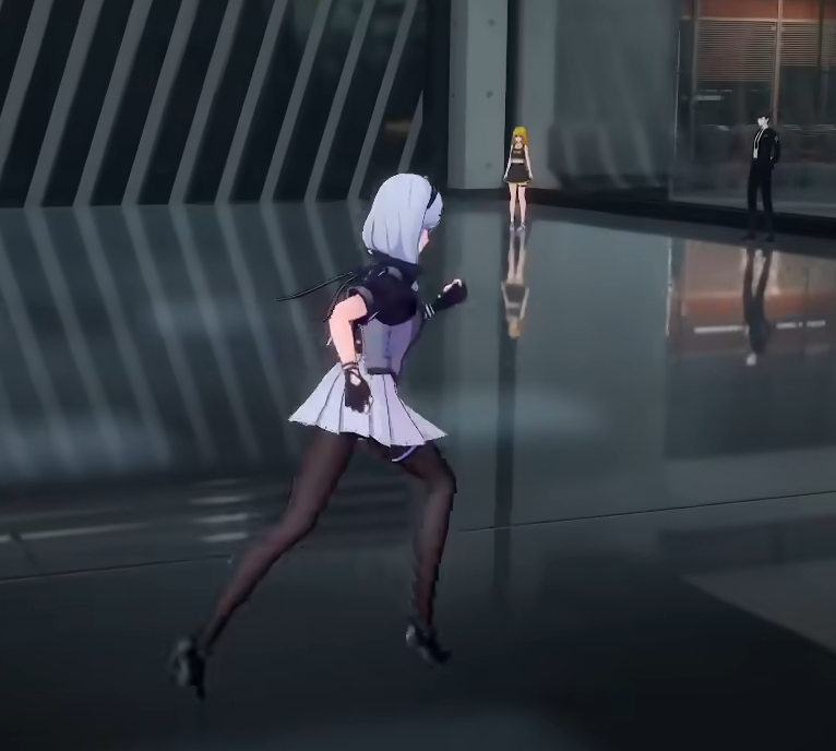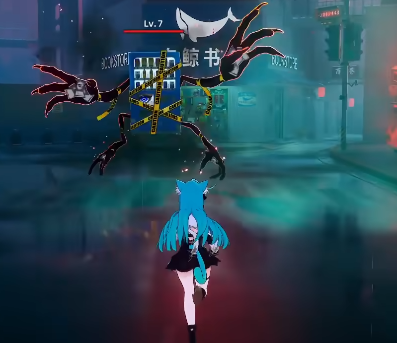 在穿过车厢之后我们来到了一片全新的空间。这里如同某个市区的街道,在前进的过程中会遇到新的敌人。这里会提到闪避和极限闪避,我们在敌人攻击的一瞬间可以进行闪避,从而躲开敌人的伤害。