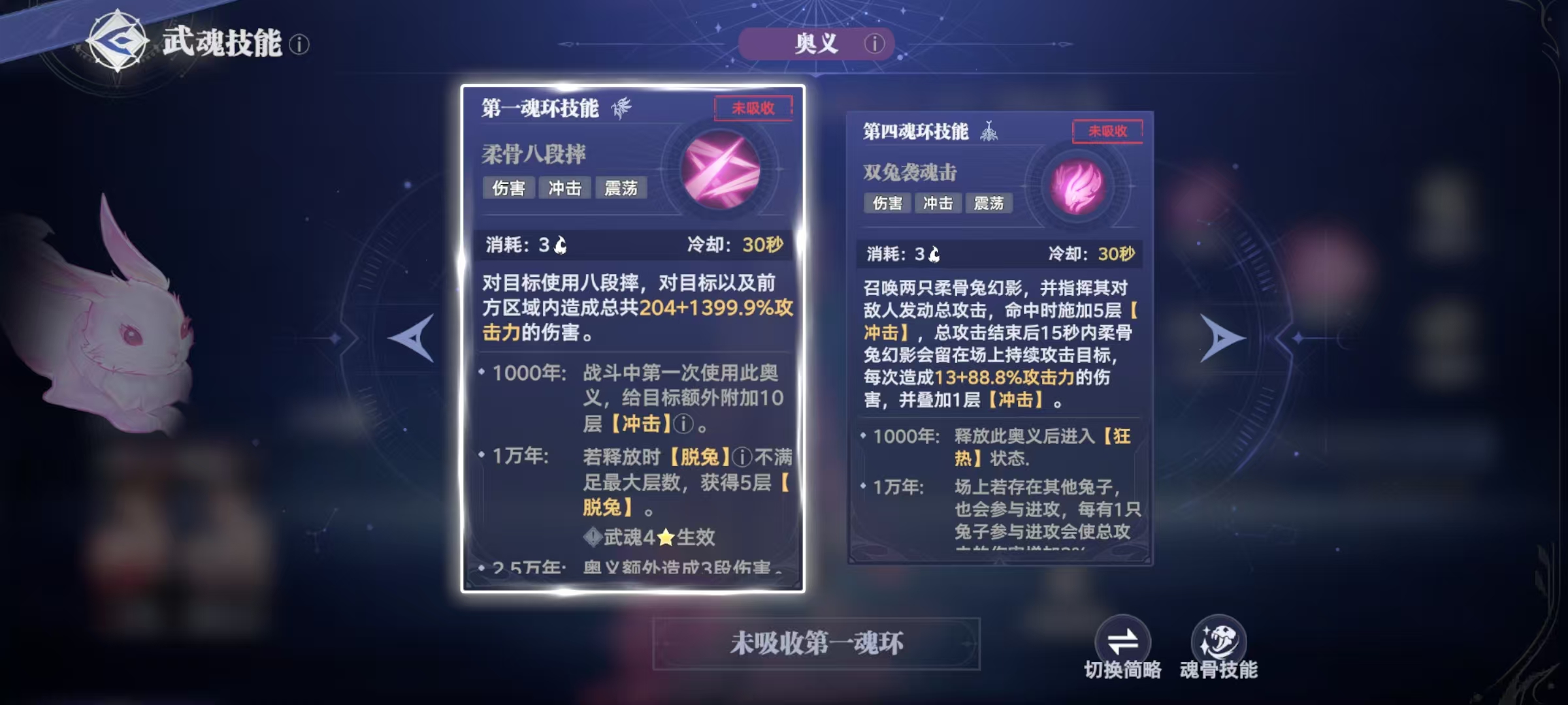 自身释放第一魂环技能可对目标使出八段摔,在前方区域造成高额伤害,第四魂环技能是召唤两只柔骨兔幻影向敌人发动攻击。第二魂环技能是释放后获得一层脱兔效果,对敌人使用飞踢,命中敌人可派生后续的连续踢击,在此过程中可以点击普攻按键来中断,在获取了脱兔状态后,该技能的冷却时间还能降低。从这些技能效果来看,在持续输出方面非常出色,也有一定的爆发能力。