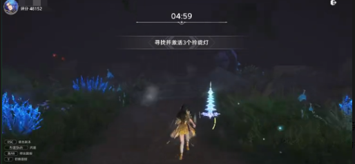 在点击试炼按钮之后,马上就接到了任务,任务其实很简单,要求玩家在5分钟的时间内找到三个玲珑灯,并且要完成激活。玩家可以操控角色,朝着小道上前行,可以看到在夜光的照射下,蓝紫色的植物也会闪烁着光芒。来到一个绿色喷泉边上,找到了第1个玲珑灯。