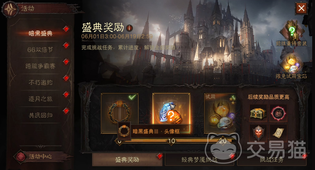 “暗黑盛典”活动的核心玩法之一是每日任务和经典梦魇挑战。在活动期间,玩家通过完成每日解锁的任务,将逐步积累奖励进度。随着进度的推进,玩家将能够解锁包括自选高品质传奇装备、空白契约、强化不朽钥石等多项珍贵奖励。值得注意的是,随着奖励进度的提升,玩家获得的传奇装备将会有更高的词条概率,这为战力提升提供了极大的帮助。