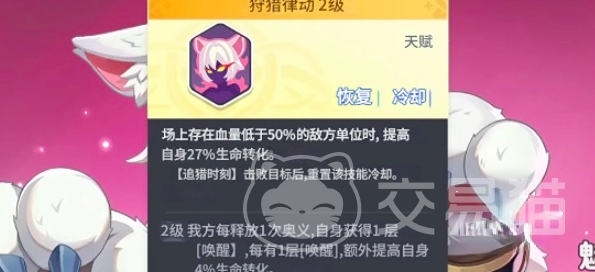 而要说起其技能的话,芬里尔的天赋是狩猎律动,在场上若存在着血量低于50%的敌方单位,则会提高自身27%的生命转化。奥一完成击杀则可以实现重置冷却,而当该角色达到六星级,则可解锁2级天赋,每次释放奥义则可叠加一层唤醒buff,且每层都可获得额外4%的吸血值。当我方释放一次奥义时,则可自身获得一层奥义,每一层唤醒额外提升自身4%的生命转化。