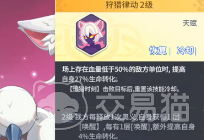 当战场中存在生命值低于一半的单位时,猫女会触发一项特殊能力,吸血效果将得到显著提升。如果猫女在施展奥义技能时成功击杀目标,该技能的冷却时间将会立即重置。当猫女达到六星等级时,会解锁第二层天赋效果,每次释放奥义技能,都会为其叠加一层唤醒状态,每层唤醒状态能额外赋予猫女4%的吸血能力。在后续的天赋中,猫女还能获得攻击力的提升,并且在触发元素反应时,其攻击力会进一步增强。此外,当猫女使用奥义技能击杀目标后,还会额外获得两个奥义点。