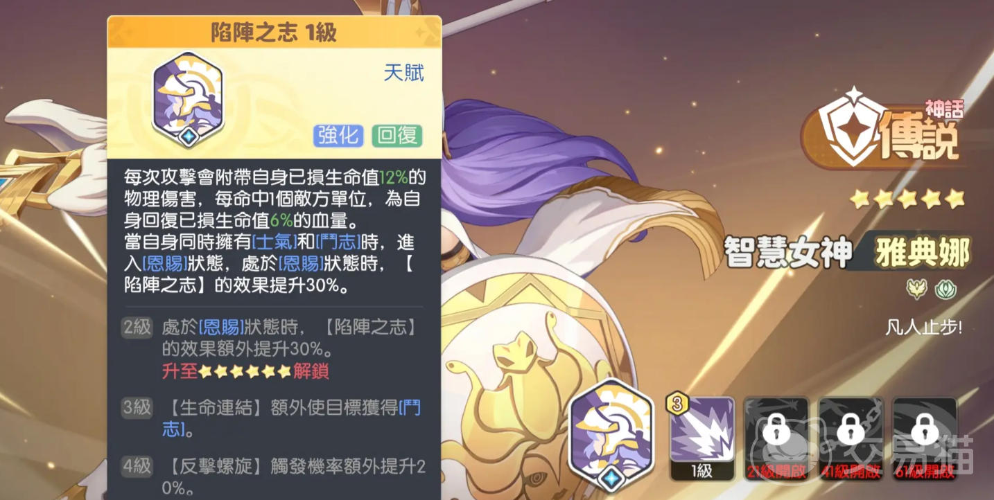 雅典娜是坦克职业的天花板,自身能抗能打,她的被动天赋能在每次攻击的时候附带上自身已损失生命值的额外伤害,并且每成功命中一位就能帮助自己回血,她的奥义有着较大的圆形范围,能造成8秒的范围嘲讽,并生成一个60%血量的护盾,自身血量越少还会加快怒气的获取,“生命链接”能在有队友血量低的时候,帮助提供面伤并分摊伤害,“反击螺旋”能在遭受伤害的时候,有概率进行范围反击,整个角色集坦度、控制、保护伤害为一体,唯一的缺点是培养成本比较高。