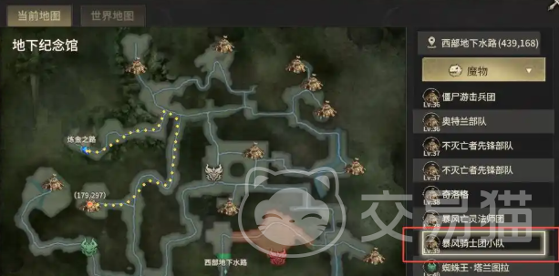 大家顺利传送到炼金之路后,再点击右上角小地图查看当前地图,并选择魔物里面的暴风骑士团小队来帮助寻路,寻路结束后就能在附近的区域找到流民们,准确坐标是160,294处,和一阶段同样抵达对话就可以直接完成。