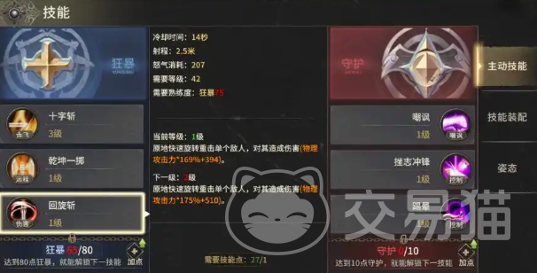 技能上优先升“狂暴斩”、“旋风斩”和“暴怒”,狂暴斩会向着前方斩击,对一条路径上的所有敌人造成物理输出,旋风斩能让自己化身为旋风,对周围敌人持续造成输出,能一次对付多个敌人,暴怒会在积攒力量后,发动攻击造成高额伤害的同时还有概率让目标陷入眩晕。