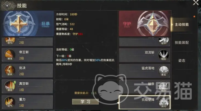 技能优先升“嘲讽怒吼”、“钢铁壁垒”和“生命虹吸”,嘲讽怒吼会发出怒吼,吸引周围怪物的仇恨,使其攻击自己,是坦克的关键技,钢铁壁垒在开启后获得一层护盾,帮助提升生存能力,生命虹吸能在每次攻击时,将敌人的生命值吸取转化成自己的,通过此技能可以维持血量健康。