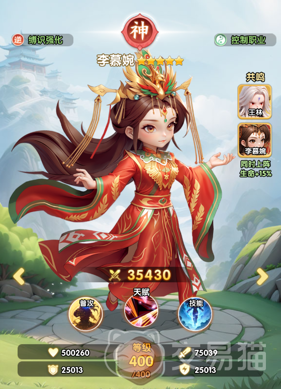 技能“情根深种”,对敌方当前生命值最低的2名修士造成190%的法术伤害,并有60%的概率使其获得1层“缚识”,“缚识”每回合扣除施法者攻击力15%的生命,无视防御,最高叠加5层。
