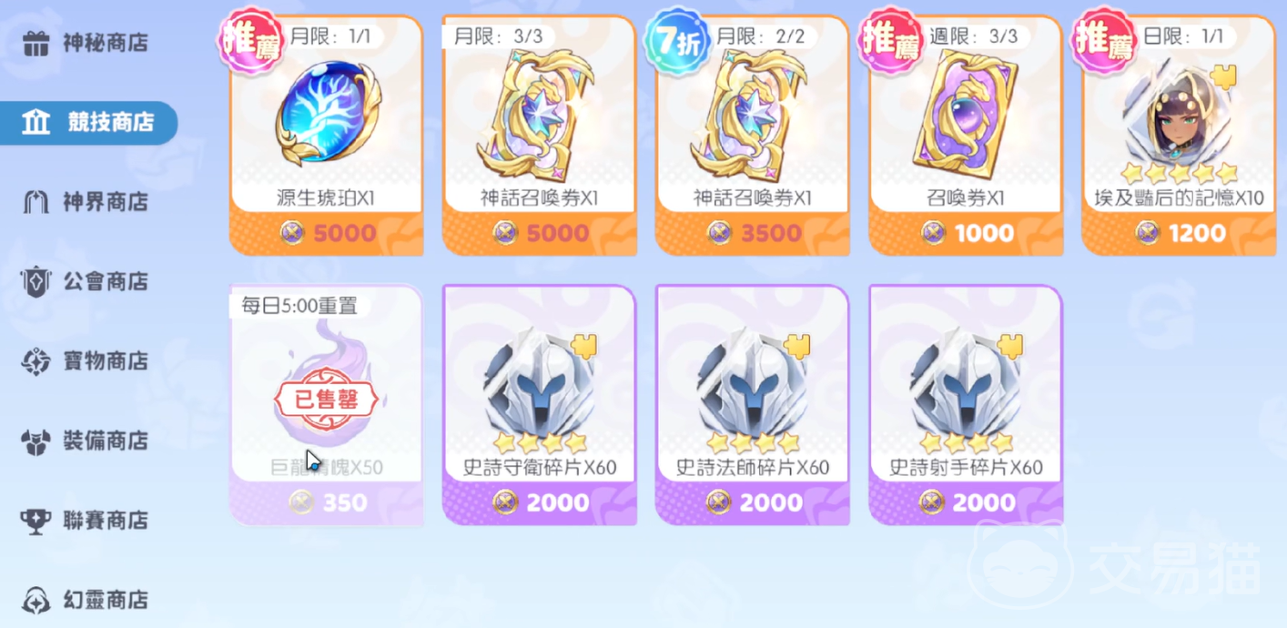 如果大家积极参加竞技场对战的话,那就可以获得各种竞技场货币,只要胜利了之后就能获取荣耀币。这时就可以用荣耀币兑换不同品质的幻灵碎片,例如强大的耶梦加得。然后也能选择兑换竞技场专属装备,进一步提升你的实力。也可直接兑换召唤券,在卡池中抽取你所需要的幻灵。