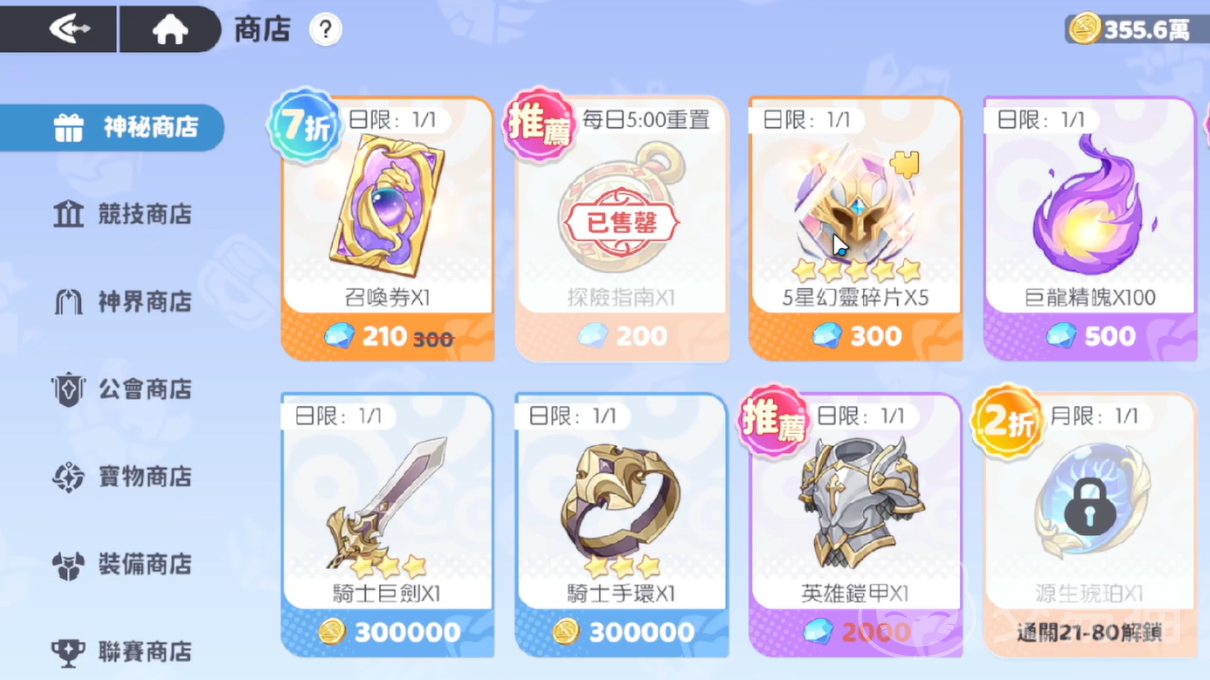 如果大家想兑换幻灵碎片的话,就可以去常规的日常商店。日常商店每天都会自动刷新一次,当然大家也可以选择手动刷新。然后就可以在这里买到不同品质的幻灵碎片,R/SR/SSR概率出现。另外也可以在这里选购一些幻灵升星材料和经验材料,这样就能够更快培养强大的幻灵。