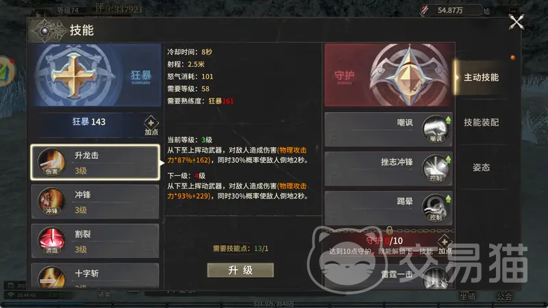 然后推荐各位学习升龙击,这是一招单体输出能力特别强的技能,爆发伤害高。最后再学一招魔狱血刹,就可以获得觉醒技,能够造成大范围高爆发伤害。连招方面的话先用冲锋起手,接着再用旋风斩接伤害,然后在衔接后面两招技能,基本上可以将对方秒杀了。