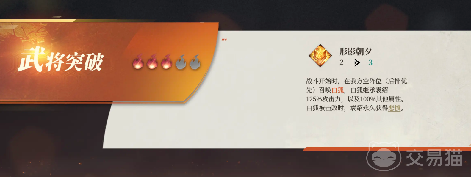 突破技则是袁绍和白狐都可以对血量比例较高的目标提供增伤,当袁绍血量降低到一定比例时,白狐会对目标使用绝技。天赋则是开局就可以召唤白虎,并且白狐能继承袁绍的属性,并拥有新的技能。白狐如果被击败则会永久降低袁绍的绝技战意消耗。