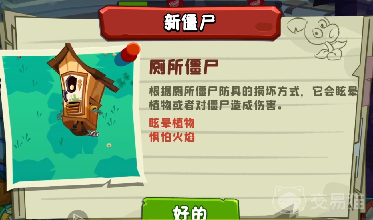 厕所僵尸是游戏中新加入的一种僵尸,其初始状态下会扛着一个木质的厕所,打破后就会变成正常的普通僵尸。但要注意,在打破厕所时,要是用全程都用的是非火焰类的植物,那在测试爆开时,僵尸会扔出道具,眩晕它所在的直线上的僵尸,且眩晕期间所有植物都无法攻击,特殊能力也不会起效。