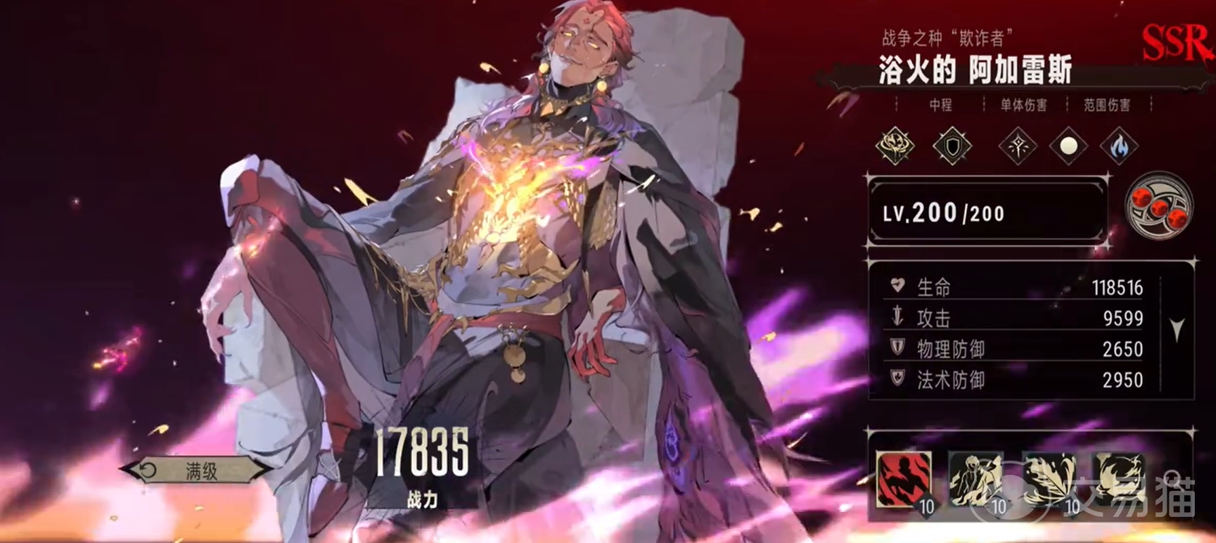 阿加雷斯自身拥有着很出色的加伤能力,而且在濒临死亡时还能进入浴火重生状态,让伤害再次得到50%的提升,有着绝境翻盘的能力。
