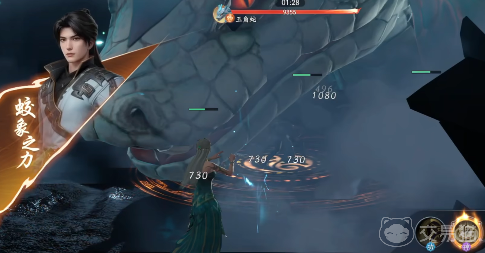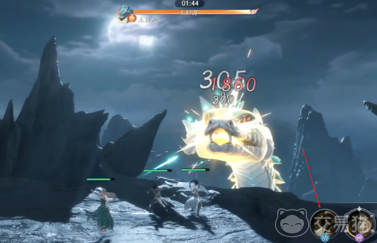 然后再来看一下他的大招,也就是所谓的觉醒技能。用了之后就会进入一段动画,这时就可以获得蛟象之力,并且全身还会散发星光,周围出现各种法阵。之后再进行蓄力一击,就会朝前方猛地一踢,瞬间让对方的血量直接下降几千。